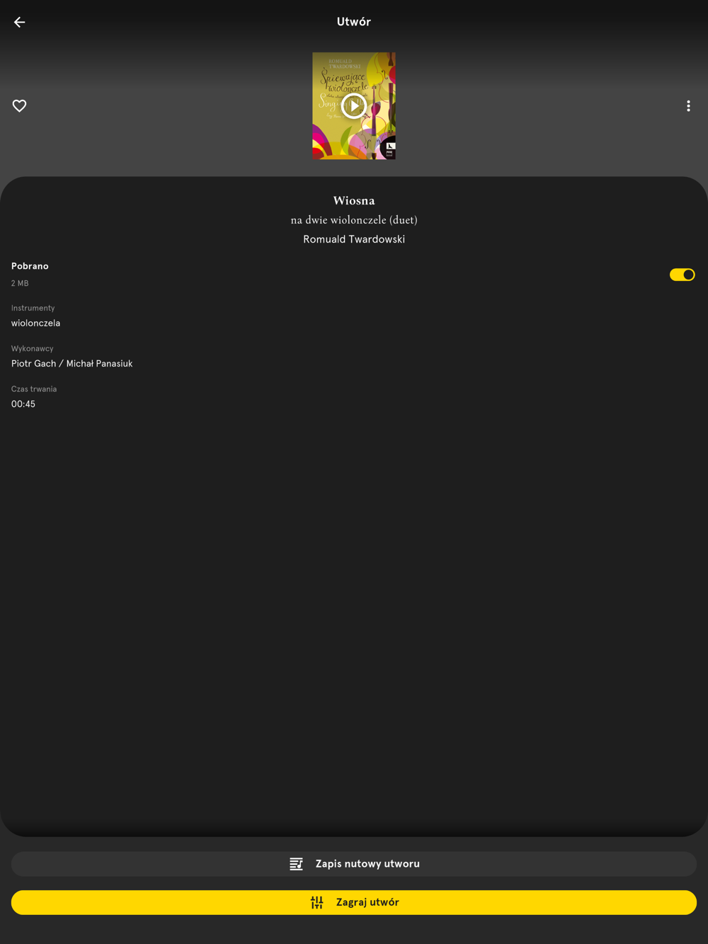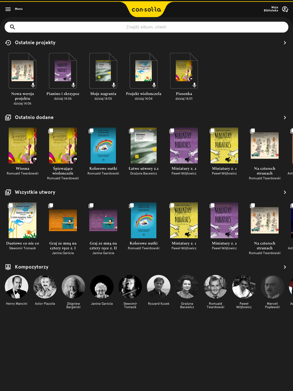 select a piece -> mute the part you want to play -> start recording -> play and enjoy a rich sound -> save the recording in your librarycon.sol.la is the application which helps the self-dependent musicians with composing wherever they want. The application provides tracks of two- and more part pieces (e.g. a melodic line of a certain piece and its accompaniment, or all the parts of chamber pieces). Muting the part you want to play allows you to practice / perform the pieces with all the instruments without the need to meet other musicians. Every time you practise you can record and save the piece – it enables you to compare different versions and interpretations and to observe your progress. The saved files can be shared. con.sol.la contains the pieces of various levels of difficulty – it can be used by the complete beginners as well as the professionals. The list of the pieces includes the works from different periods, from Baroque to contemporary music, educational and orchestral pieces. New works are continuously being added to the catalogue. It includes chamber pieces for different instruments: strings, winds, keyboard, and percussion. They can be looked up very easily by choosing the selected instrument or category. Every title contains basic information about the piece and its composer. Functional layout and a transparent design of con.sol.la make it a convenient and user-friendly tool for perfecting musical skills and playing online.