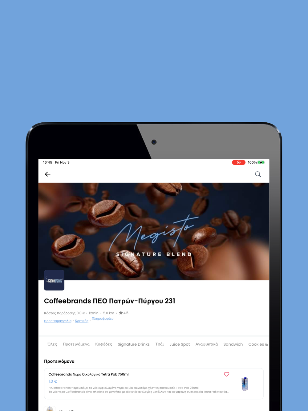 Τώρα μπορείς να παραγγείλεις Megisto Espresso, καφέδες ροφήματα και σνακ στο σπίτι ή το γραφείο από τα Coffeebrands που βρίσκονται κοντά σου με την εύκολη και γρήγορη δημιουργία παραγγελίας που προσφέρει η εφαρμογή.