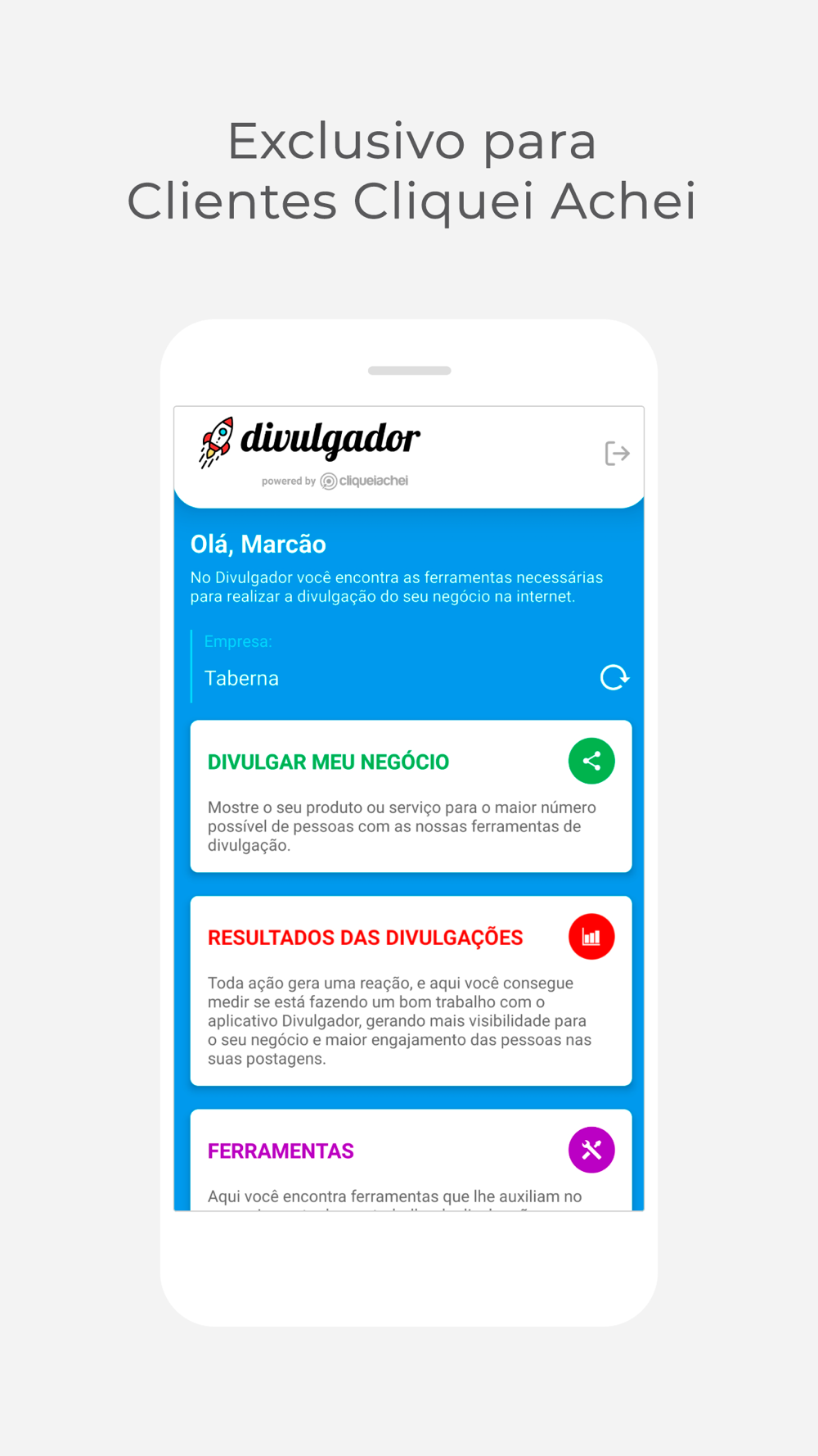 O aplicativo Divulgador é uma solução criada pelo Cliquei Achei para que micro e pequenos empresários possam divulgar sua empresa de forma fácil na internet e também acompanhar os resultados.