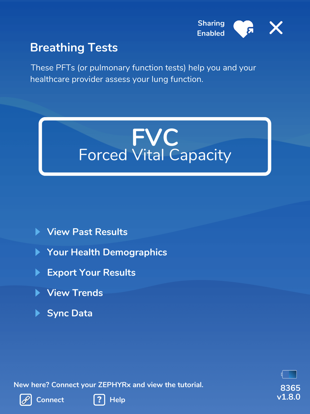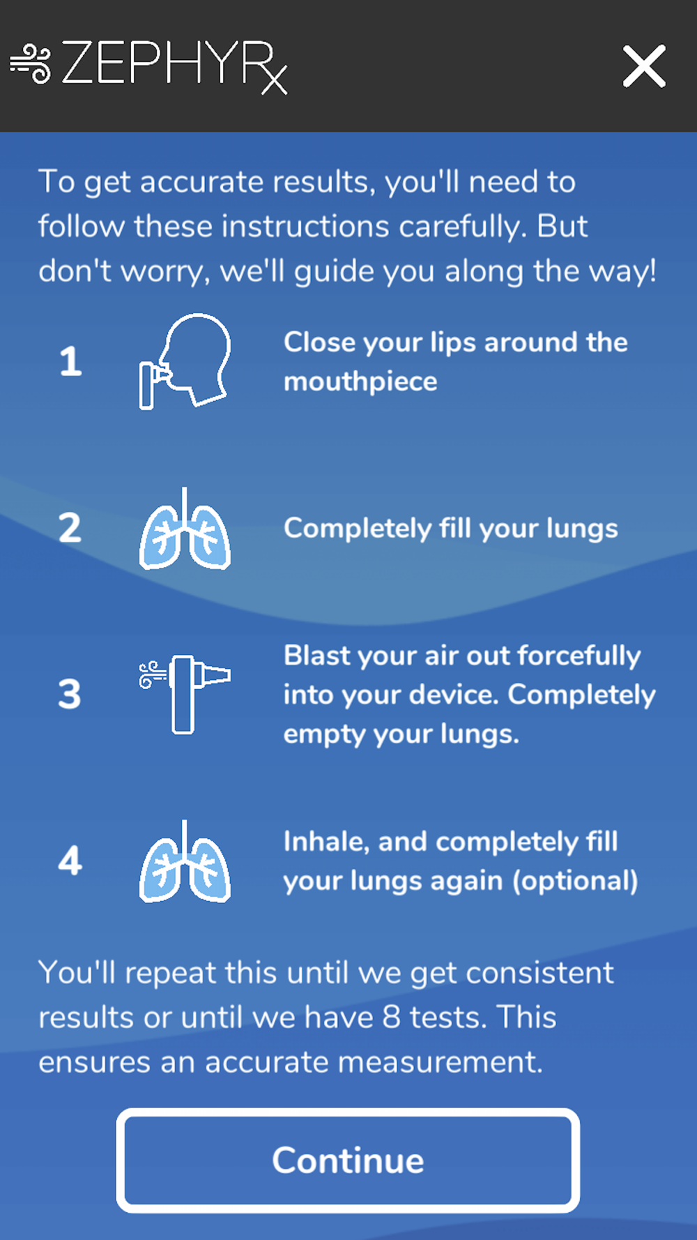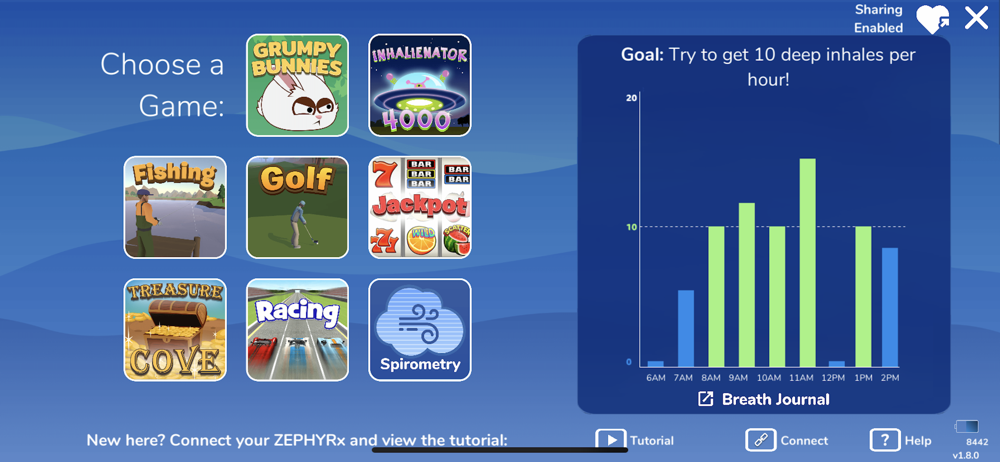 Die ZEPHYRx Breathe Easy-App ist sehr intuitiv und einfach zu bedienen, mit Schritt-für-Schritt-Anleitungen und motivierenden Nachrichten während Ihres gesamten Spirometrie-Tests. Es verbindet sich über Bluetooth mit einem persönlichen Spirometer, erfasst Testergebnisse und sendet diese Daten in Echtzeit an ein sicheres, webbasiertes Anbieter-Dashboard. Breathe Easy bietet Schlüsselfunktionen wie Spirometrie-Aufgabenerinnerungen, integrierte Videoanrufe, mit denen Ihr Anbieter Sie durch Ihren Test führen kann, und acht Atemübungsspiele.