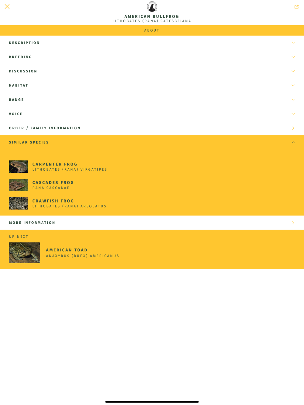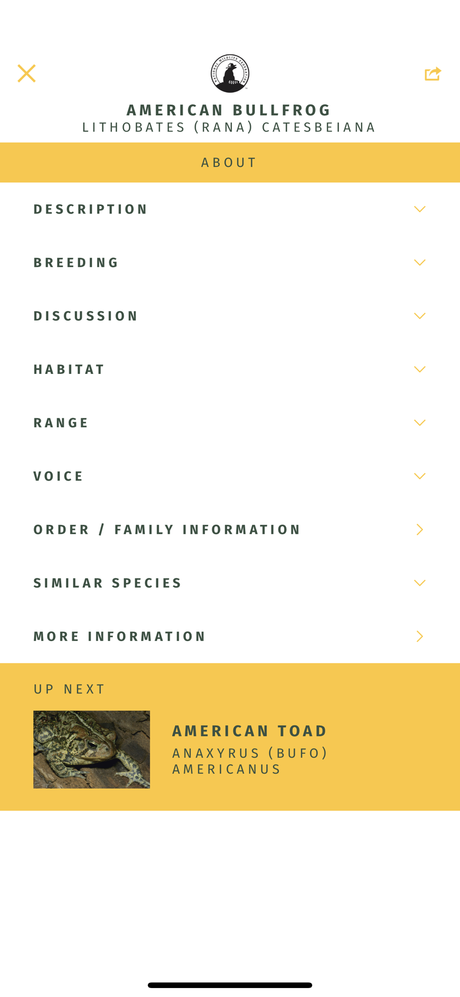 • Search by name (common and scientific) using either keyboard or verbal search systems; type or speak all or part of an amphibian’s name to search for its detailed account.