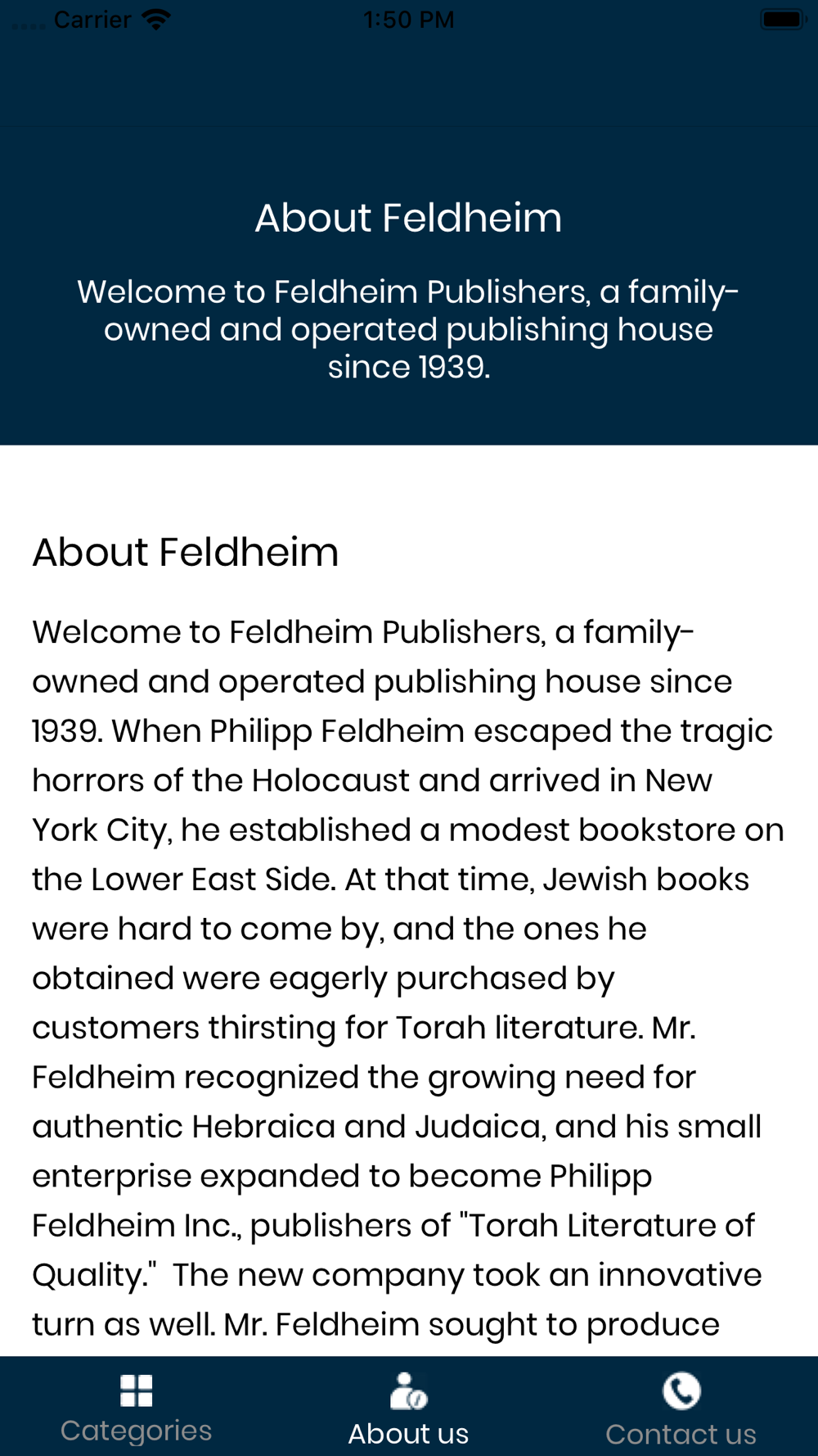 Welcome to Feldheim Publishers, a family-owned and operated publishing house since 1939. When Philipp Feldheim escaped the tragic horrors of the Holocaust and arrived in New York City, he established a modest bookstore on the Lower East Side. At that time, Jewish books were hard to come by, and the ones he obtained were eagerly purchased by customers thirsting for Torah literature. Mr. Feldheim recognized the growing need for authentic Hebraica and Judaica, and his small enterprise expanded to become Philipp Feldheim Inc., publishers of "Torah Literature of Quality."
