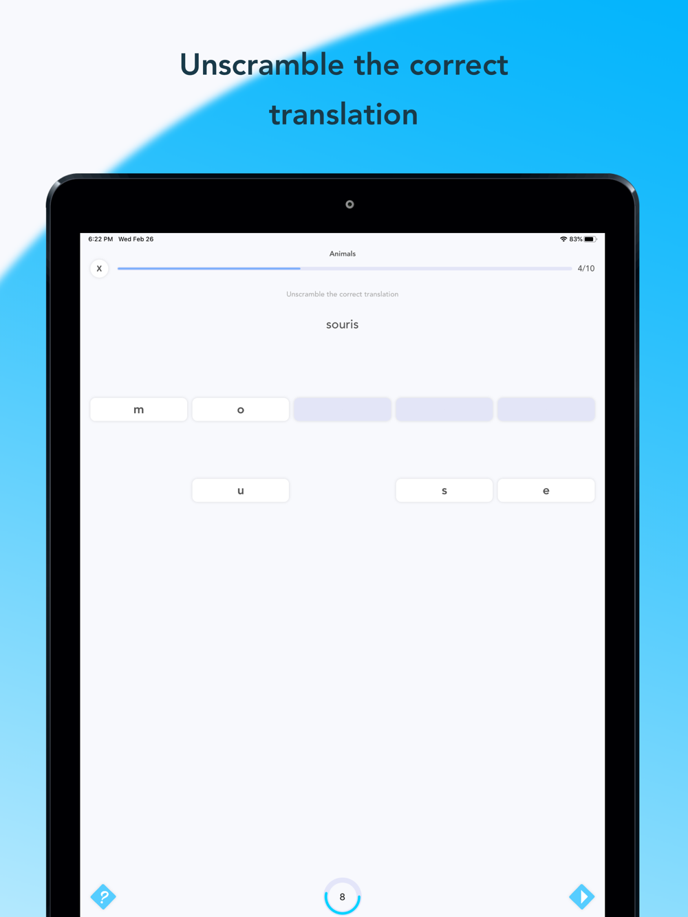 Learn through a variety of games and topics; unscramble the word, structure the sentence and beat the hangman. Every game is an opportunity to test your knowledge, check how you’re doing and grow your vocabulary. Don’t let time stop you, play for as long or as little as you want and track your progress against each topic.