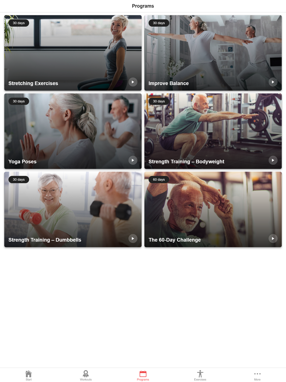 This app contains physical activity guidelines for older adults, aged 65 and over, for general health and fitness, including simple workouts and programs for building exercise into your day. Doing exercises to improve your strength, balance and flexibility will help make you stronger and feel more confident on your feet.