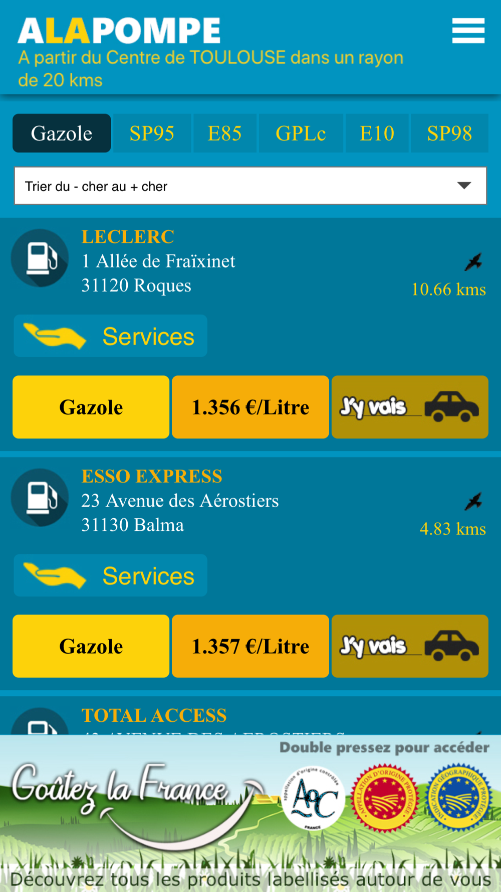 "A la pompe" est une application qui permet à un utilisateur, via la géolocalisation de son appareil, de lister en temps réel dans un rayon choisi autour de lui, toutes les Stations Services délivrant du carburant pour véhicules terrestres, en affichant en priorité celles-ci en fonction du tarif proposé au litre.