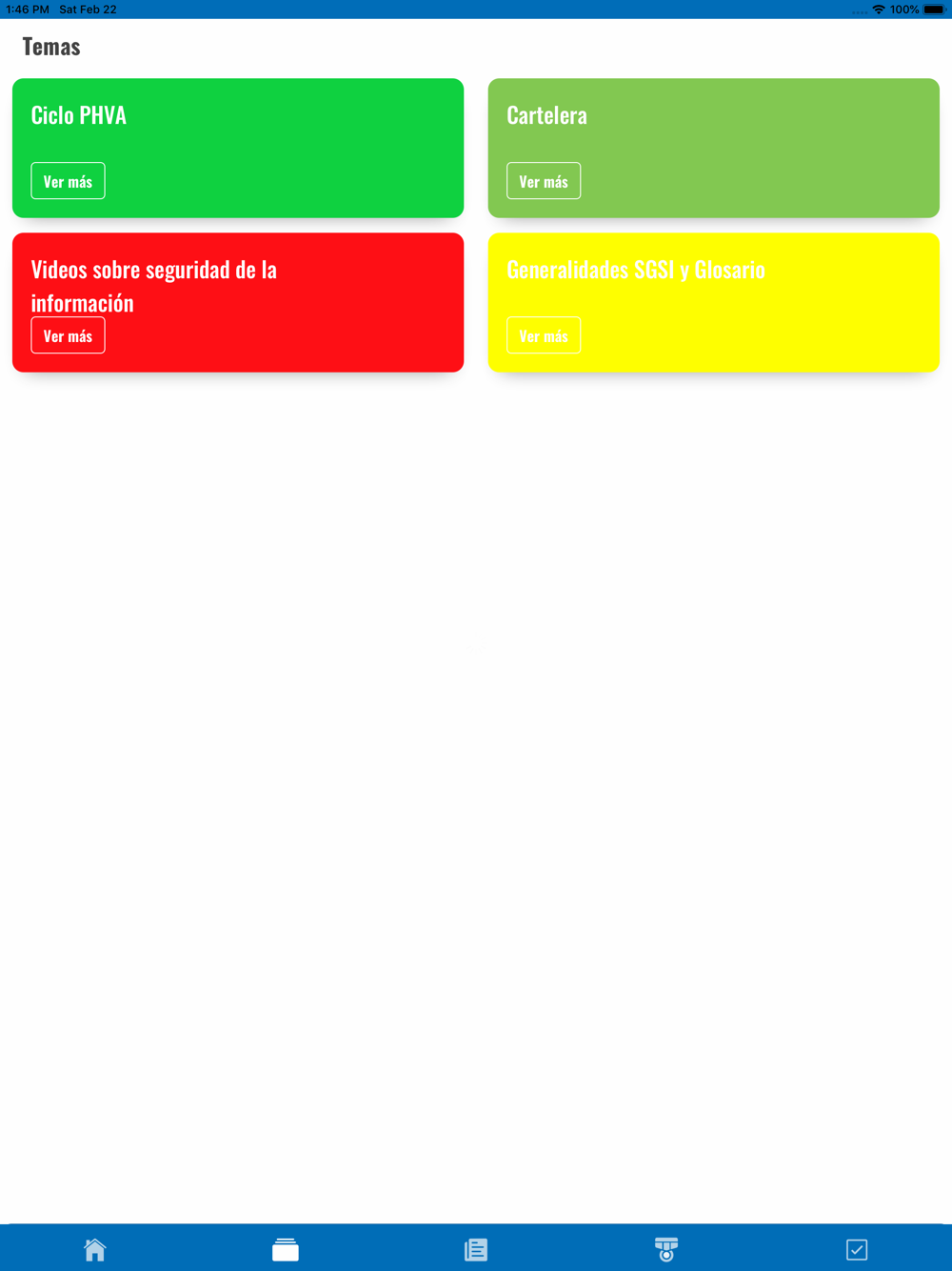 Dentro de la app tienes diferentes secciones de interés, en temas podrás encontrar una sección con todas las categorías respecto a los temas SGSI al entrar en cada una de estas te encontraras con contenido diverso en relación a dicha categoría.
