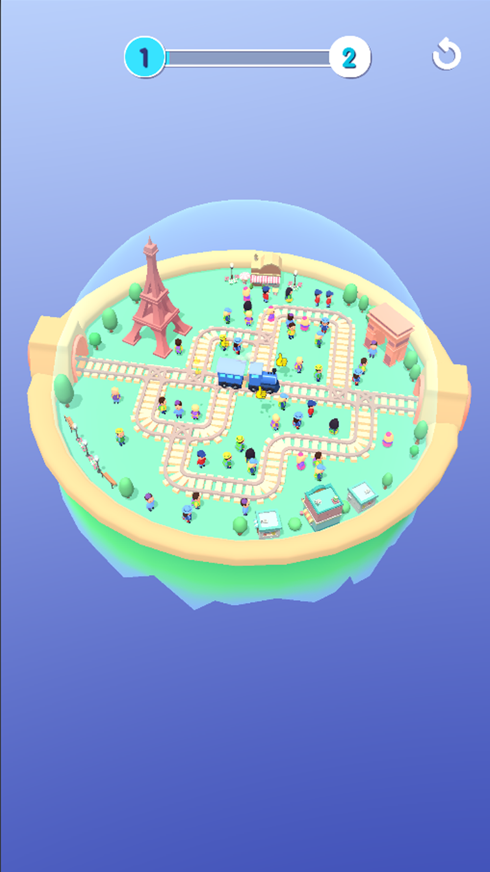 Spin that world! You need to rotate the world to let the train pick up all the passengers and reach the finish.