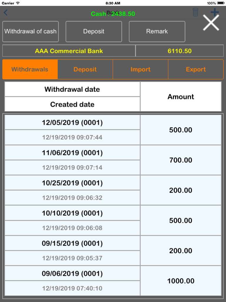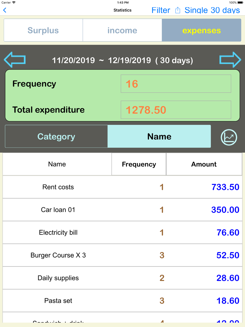 - Financial statistics : Surplus, Revenue, Expenditure statistics,Optional 7,15,30,90 day statistics and draw a graph. Left and right button can switch the previous or the next number days.