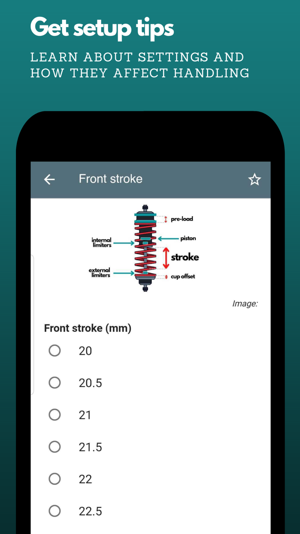 - Race log: easily record your setup changes and test/race results, so they’re always handy on your phone