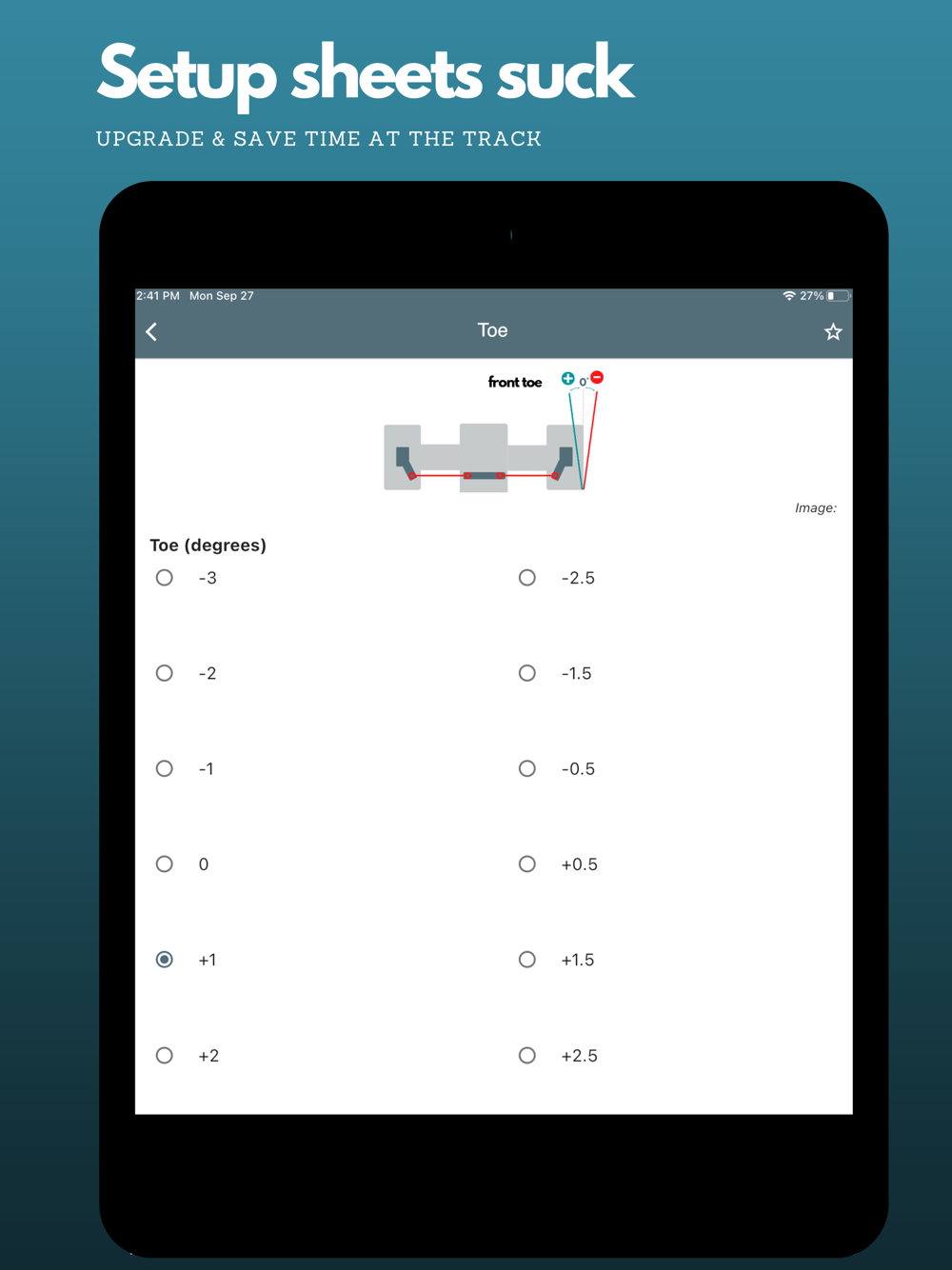 Record your car’s setups quickly and easily on your mobile device, anywhere, anytime, even offline. Leave that folder of setup sheets at home. Or burn it.