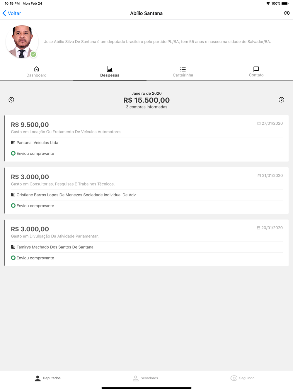 Buscamos dados do governo para exibir as despesas de cada deputado com a cota parlamentar, tal como os seus recibos, assim é possível analisar inconsistências e realizar denúncias.