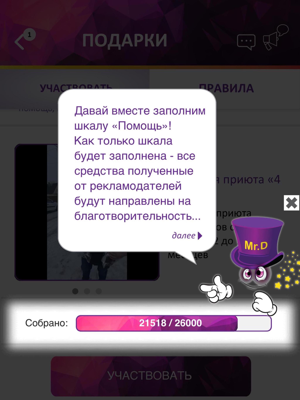 Работает по тому же принципу что и конкурсы, чтоб помочь, например, собачьему приюту, достаточно посмотреть рекламный ролик, а все вырученные средства от рекламы в данном разделе идут на конкретное Доброе дело.