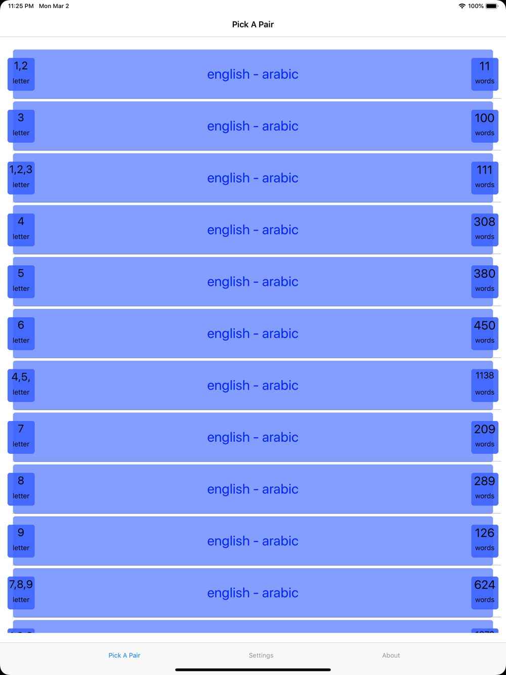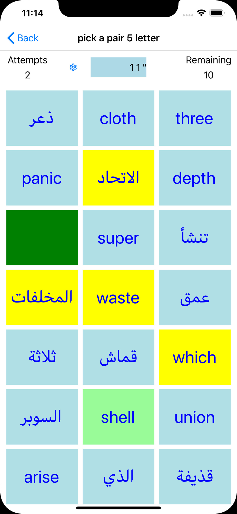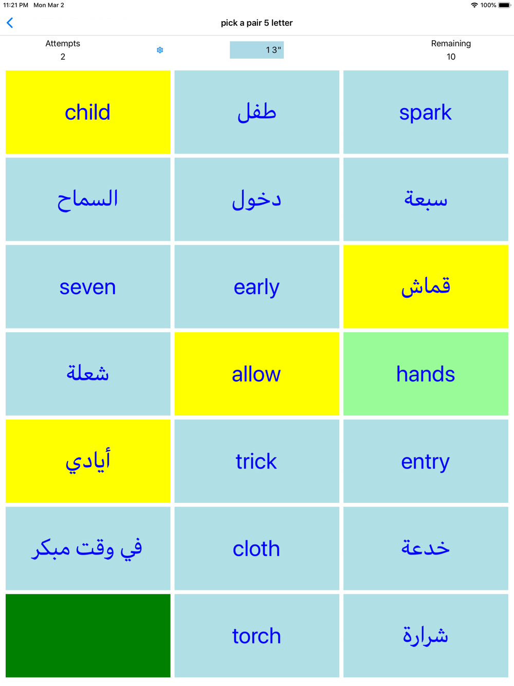 A tiny pick a pair app that helps you along, with learning the basics of Arabic. Containing 1, 2, 3, and 4 (free), 5, 6, 7, 8 and 9 letter (paid for) English words translated to Arabic for you to play at pick a pair. Test your self on the go!