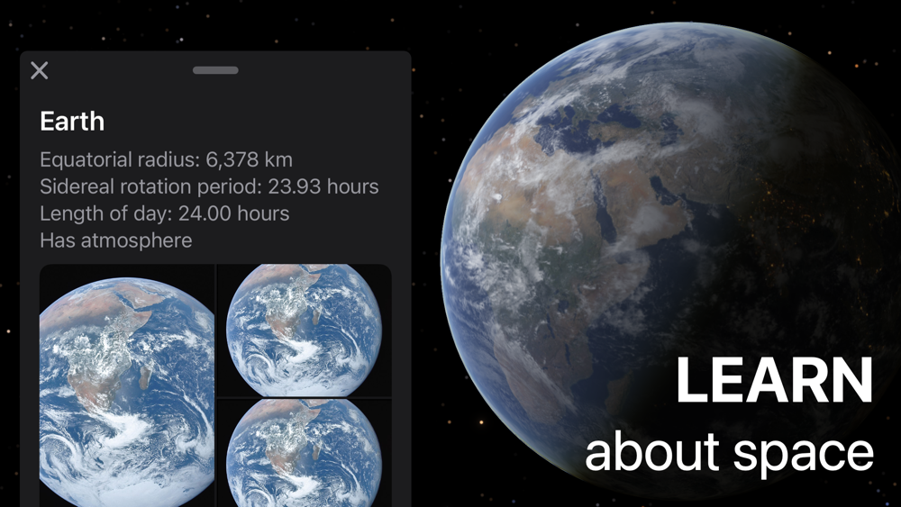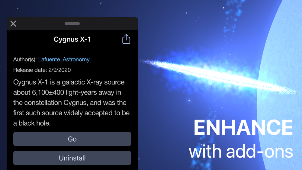 Celestia’s catalogues can be easily expanded. There are many different add-ons available containing new objects like comets or stars, high-resolution textures of Earth and other well mapped solar system bodies, as well as 3D models for asteroids and spacecraft on precise trajectories. Even fictional objects from well-known sci-fi franchises can be found.