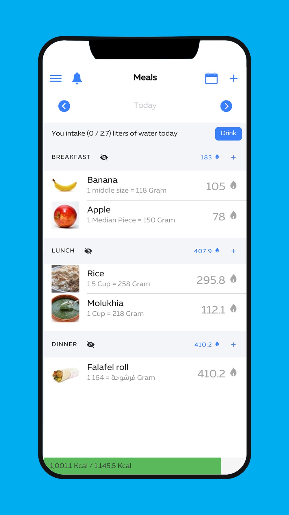 - The application alerts you by notifications at different times of the day to drink water and not to forget the prescribed portion your body needs of water.