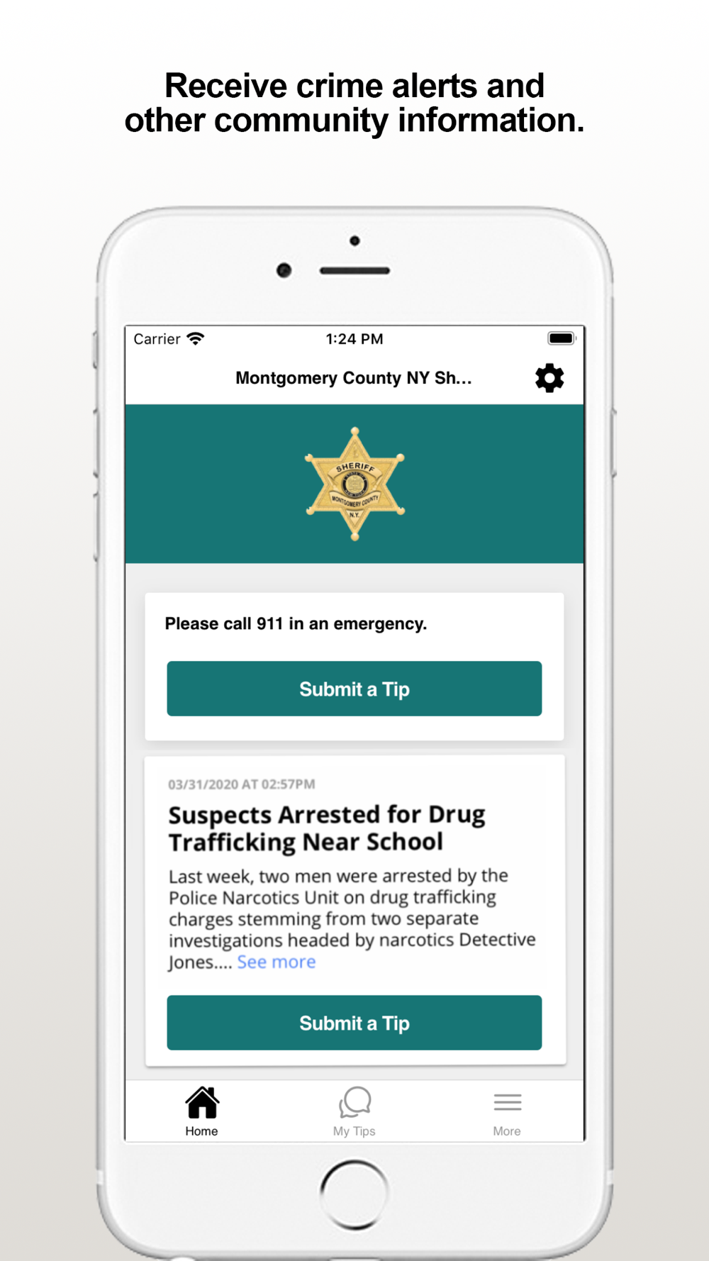 The MontgomeryCo Sheriff app provides citizens the ability to submit anonymous tips to the Montgomery County, NY Sheriff's Office. The app also displays agency crime alerts, and other organization web and social media content.
