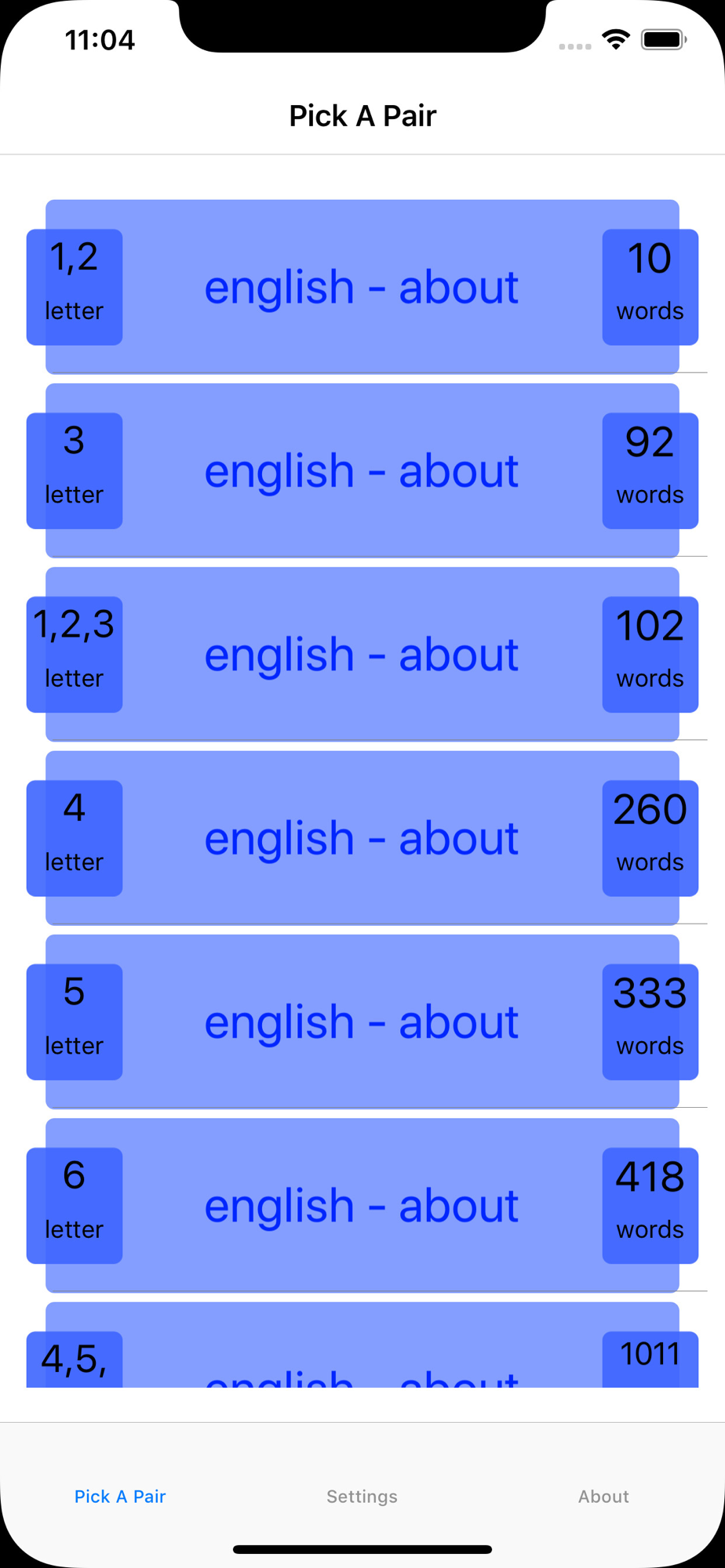 A tiny pick a pair app that helps you along, with learning the basics of Corsican. Containing 1, 2, 3, and 4 (free), 5, 6, 7, 8 and 9 letter (paid for) English words translated to Corsican for you to play at pick a pair. Test your self on the go!