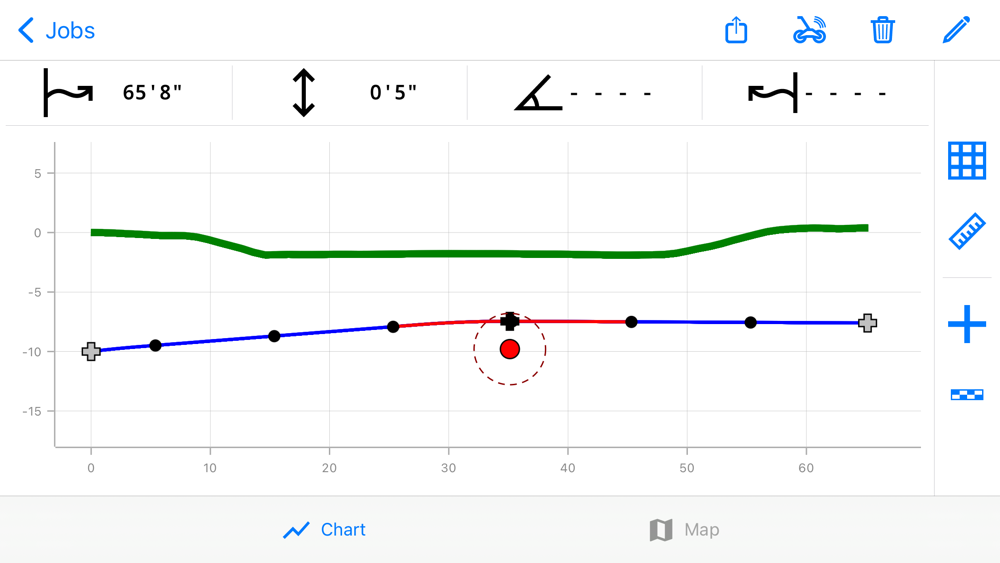 Tap and drag to any point on your mapped terrain to show the precise elevation changes. Easily view both terrain and horizontal distances. For a quick way to view average pitch along the bore, TeraTrak™ will calculate the pitch between two waypoints.