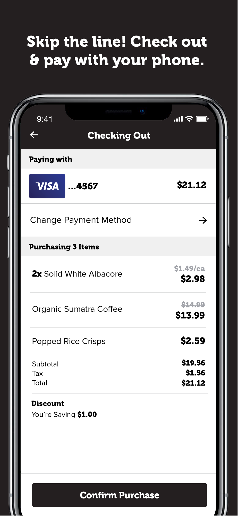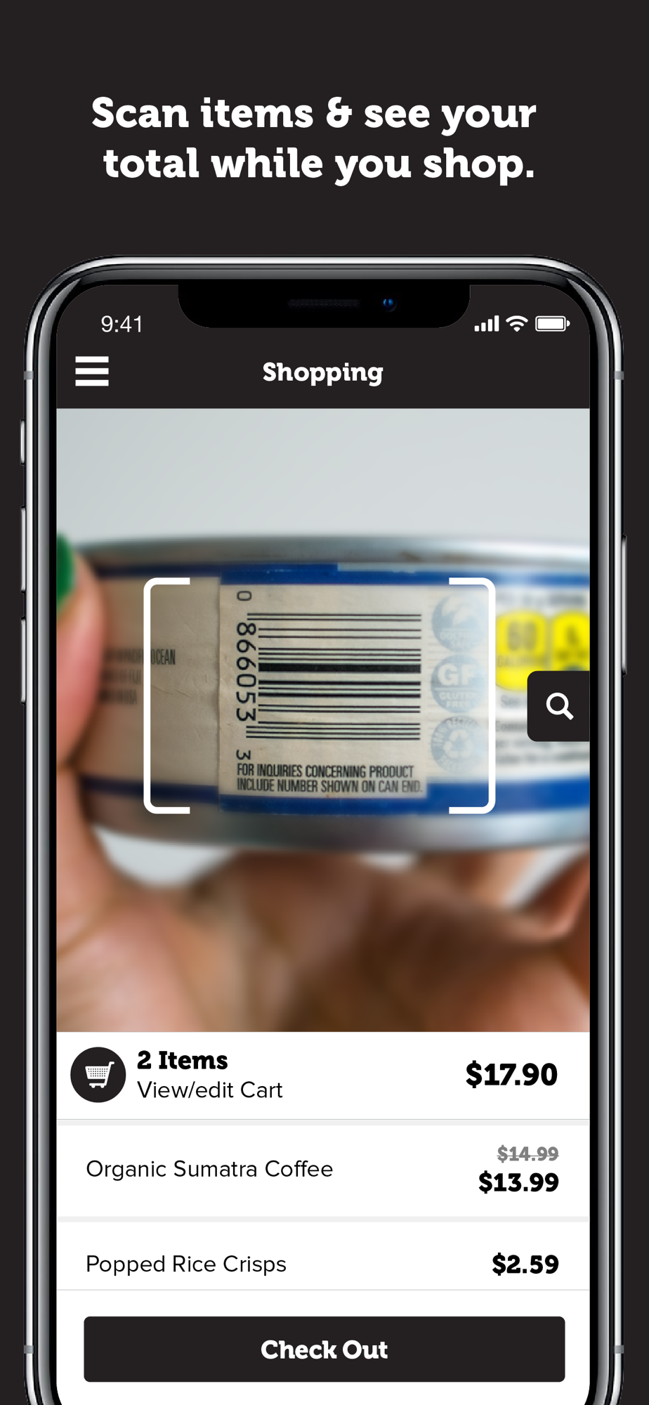 - Scan merchandise with your phone and checkout instantly without waiting in line