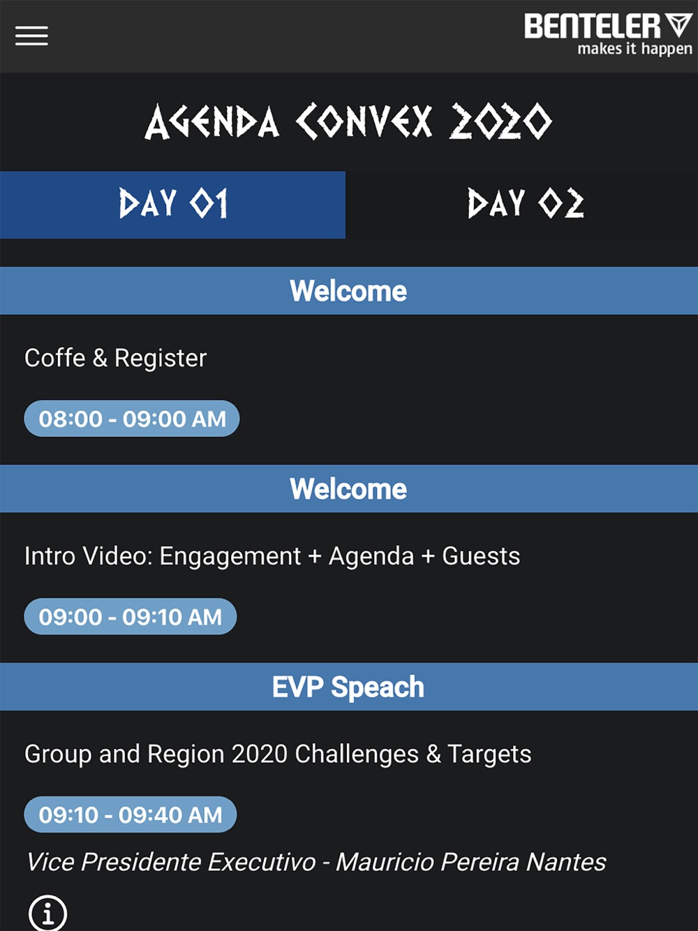 This is a annual corporate event of BENTELER Mercosur (Brazil and Africa Regions) gathering the board and managers to present the performance results of the previous year. The App contains the event agenda, the board speakers for each region, plant and area, live interaction panel, event evaluation, photo gallery and the hotel information. This year´s event is inspired in the Viking´s spirit, regarding their use of technology, ambition to discover new territories and the respect and moral values that guided this culture in regard of their internal laws, respect for women and the way their society was organized.