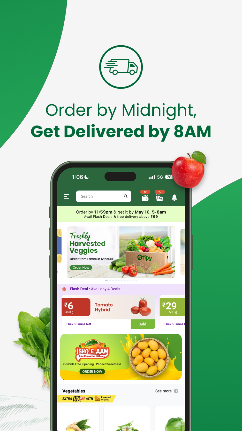 Install the Otipy app now and get your vegetables and fruits delivered to you directly from the farms in 12 hours.