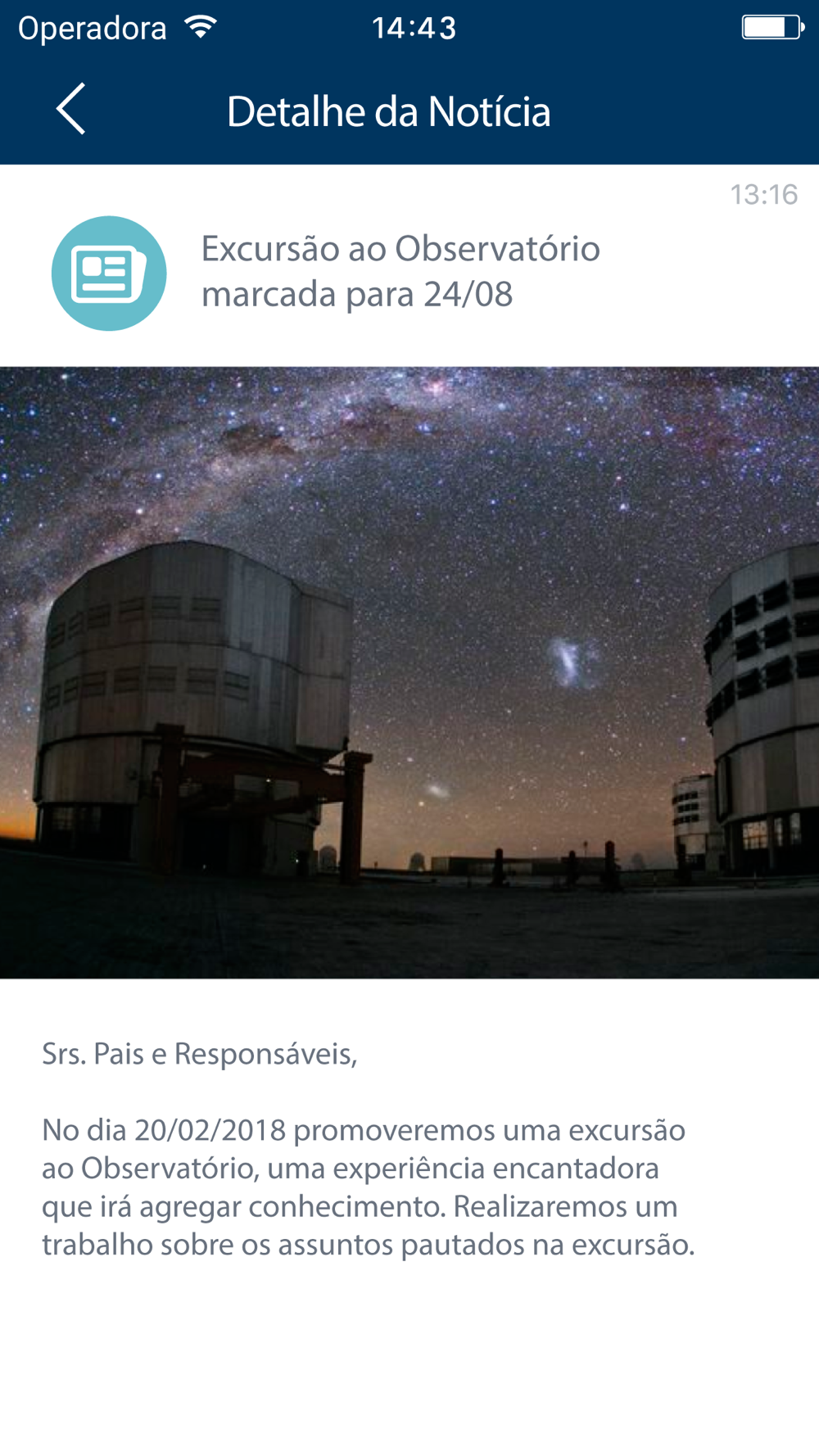 * Obs: O acesso às informações de um aluno ou usuário é privado e somente liberado usando o email e senha cadastrados junto à escola.Acesse as informações da escola através deste aplicativo.