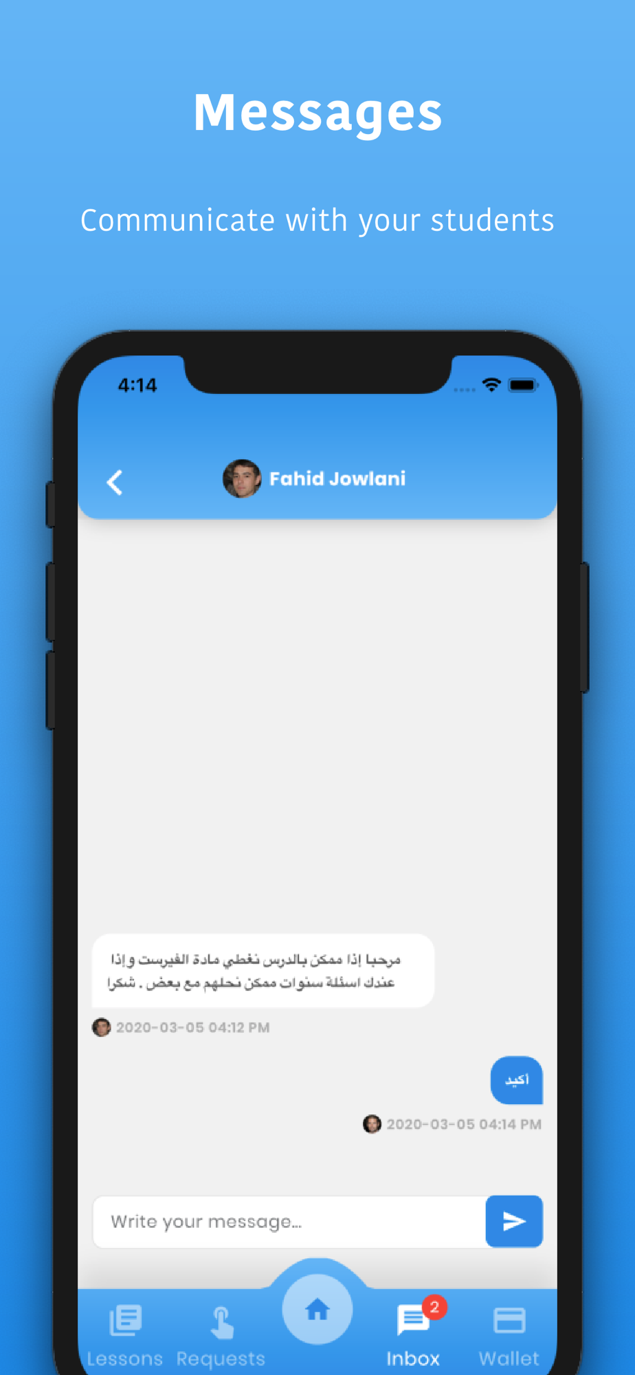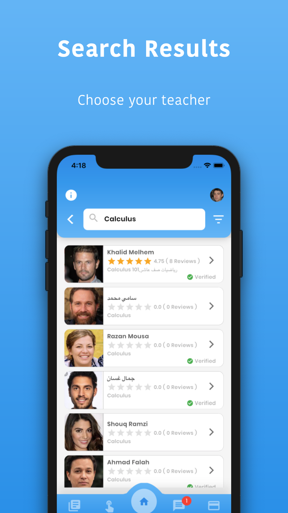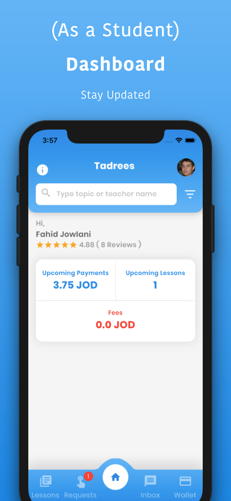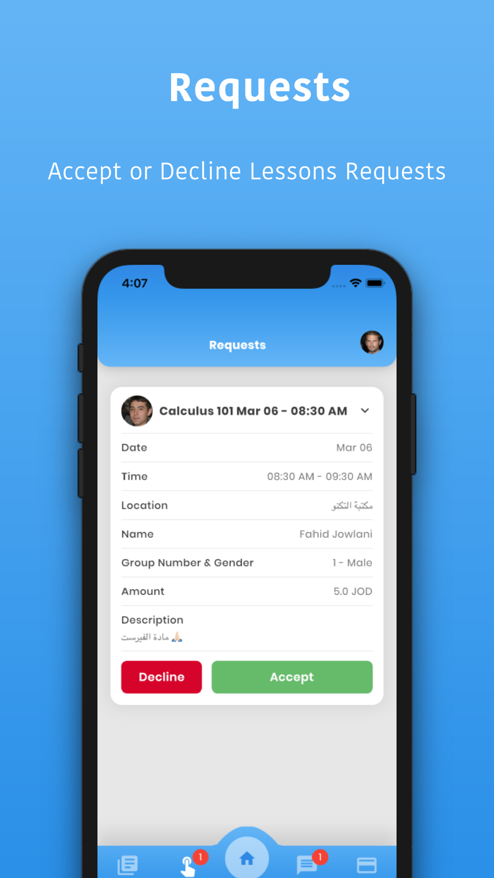 Tadrees App aims to connect students with teachers locally and lets teachers receive lesson requests with the option to accept or decline those requests. Teachers will be able to set up their profiles by adding topics, availabilities, and rates. Both parties have to rate each other after the lesson is complete, and teachers will leverage high ratings by appearing first when a student searches for their topic.