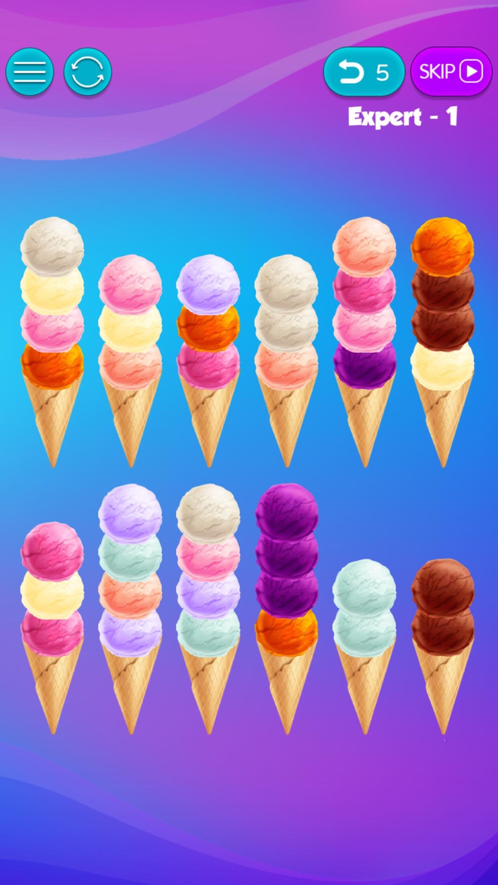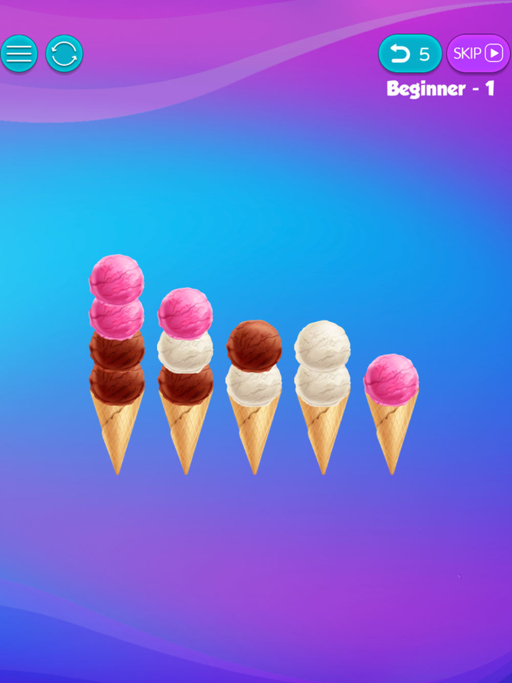 Sort the ice cream colors all onto one ice cream cone. The customers hate colors that aren't all matching, so you must solve the puzzles by taking the ice cream off of one color and placing it onto a matching color. You must do this until there are just ice cream cones with all matching colors.