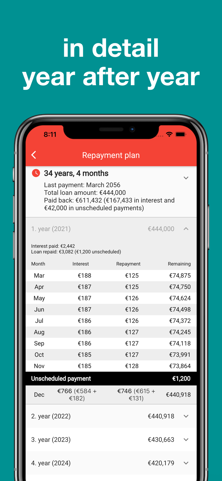 The app calculates a monthly payment plan for you, showing you exactly how much you pay in interest and repayments every month, year after year, when you have paid off which loan and exactly how much interest you paid in total. Experiment with different interest rates, fixed interest rates, monthly installments, etc. to determine your optimal payment plan.