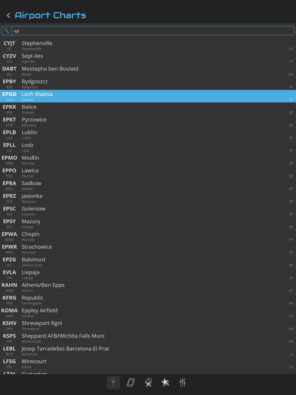 You can search an airport in the airport list. Simply enter your departure, destination and alternate airport in the Quick Flight menu for a quick access to the airport charts. Use the kneeboard feature during your flight to have all needed charts handy.