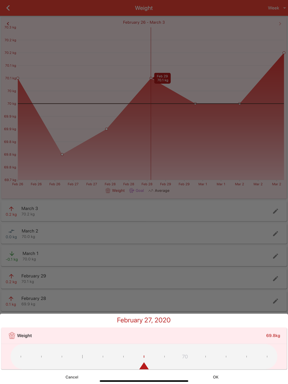 - Allows to set goals for each tracked measure - weight, waist, hips (see below for details);