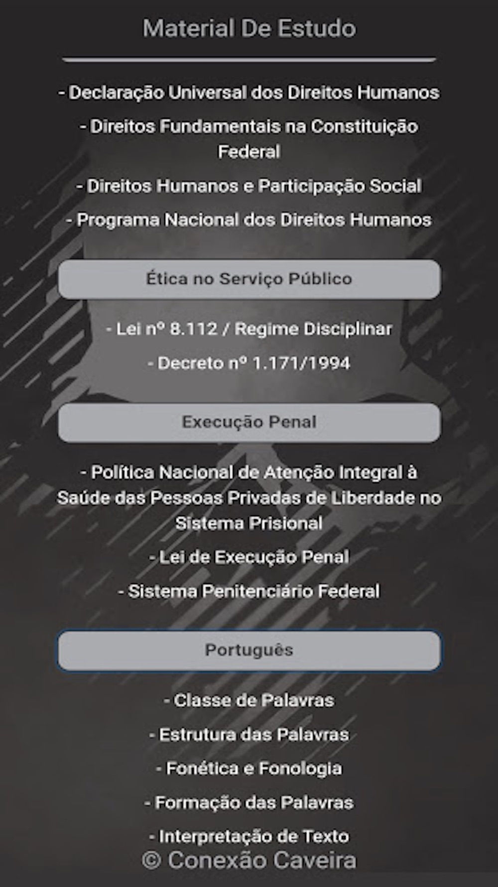 Somos criadores do projeto de estudos Conexão Caveira que tem como foco carreiras policiais. Neste aplicativo você poderá praticar e aprender resolvendo exercícios baseados no edital e na banca que está realizando o concurso de 2020.