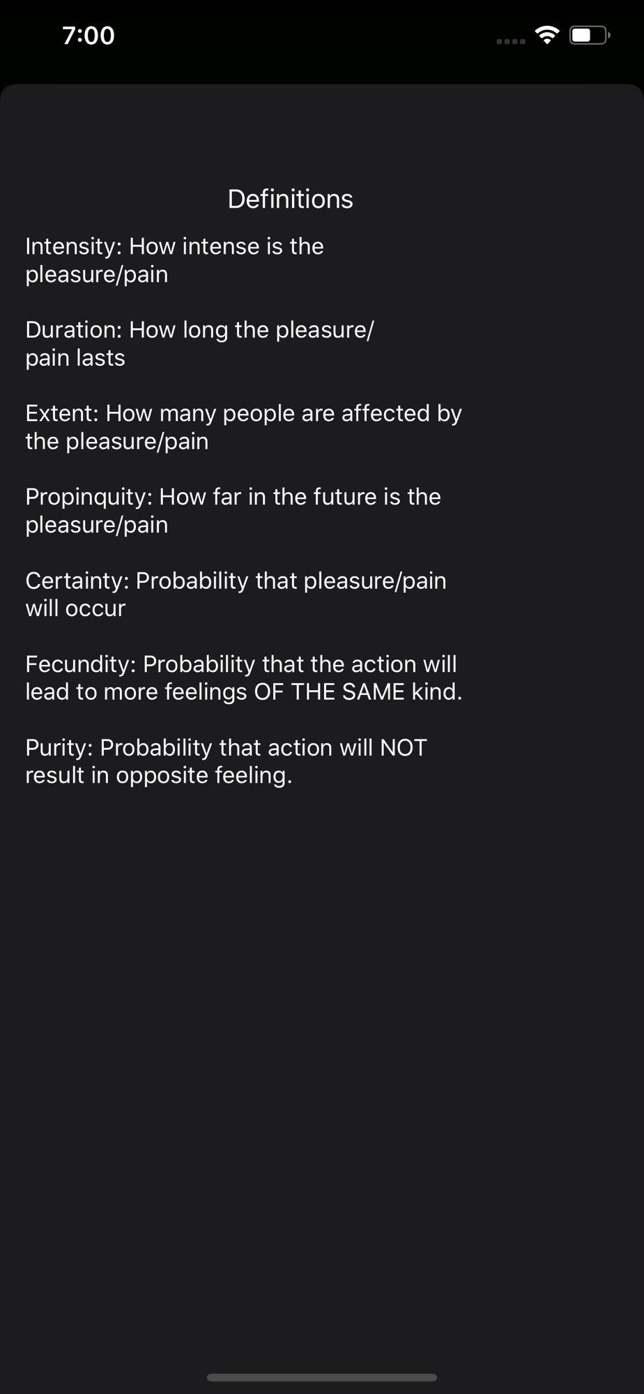Calculate whether an action is morally ethical or unethical using Felicific Calculus! Felicific Calculus was developed by the utilitarian philosopher Jeremy Bentham as a potential method of determining whether or not an action is ethical by quantifying the pain and pleasure experienced by people affected by the action. The Ethics Calculator allows you to easily use the Felicific Calculus method to determine what course of action you should take when given an ethical dilemma with this unique utilitarian philosophy. You can also easily save your results for later viewing in the app. It is the best Utilitarian Utility!