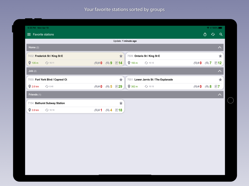 - List of favorite stations categorized by groups (home, work, friends or general).