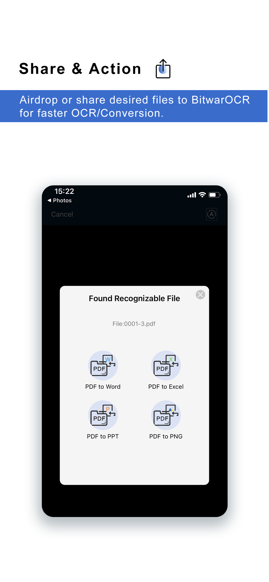 Share any of the processed Word document, excel, text, image, PDF, or PPT via Airdrop, email, message, WhatsApp, or save to your notes, Dropbox, Google Drive, iCloud, NAS, or the local storage.