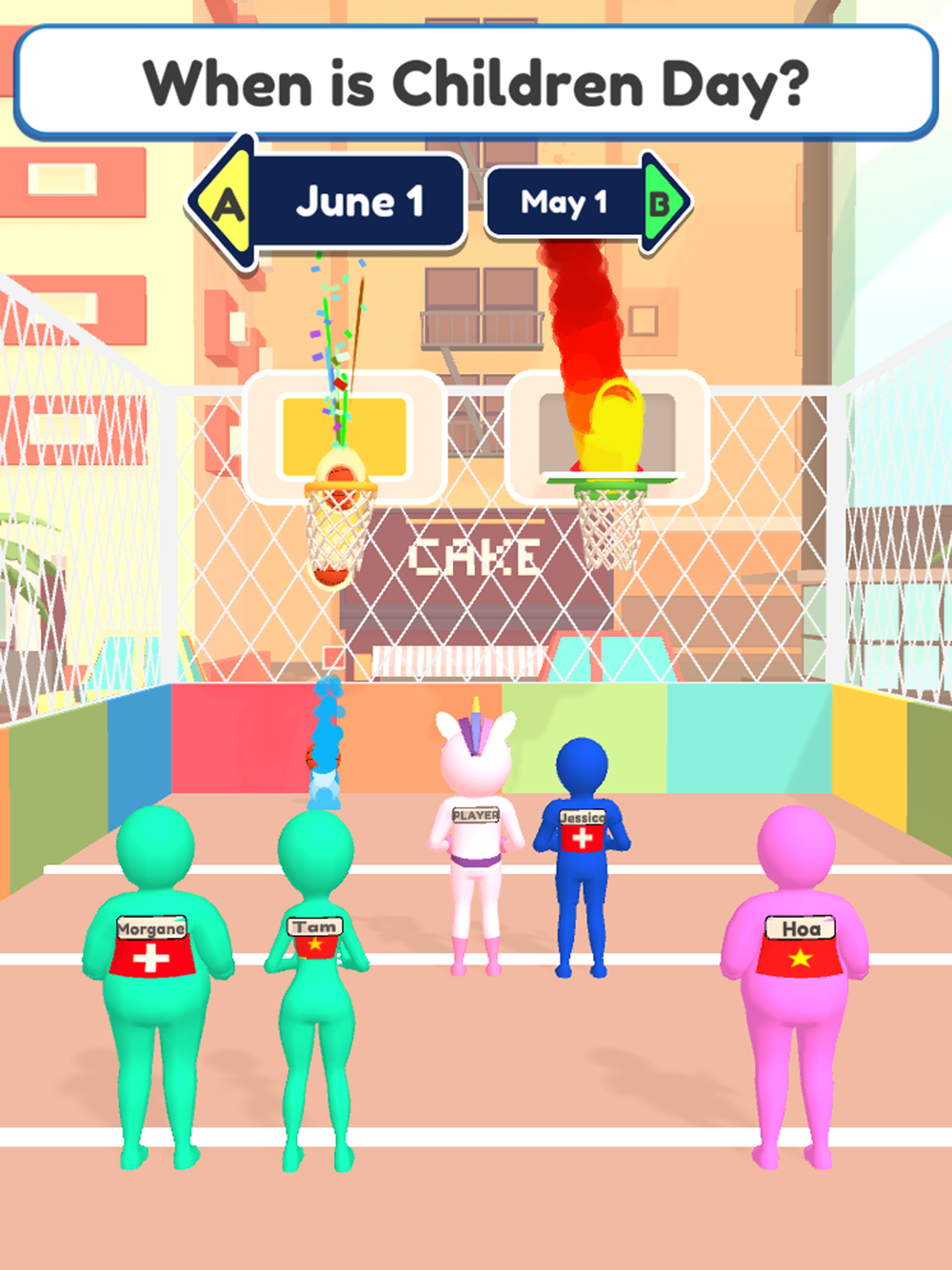 Read the question and choose the right hoop to shoot the ball in your hands!