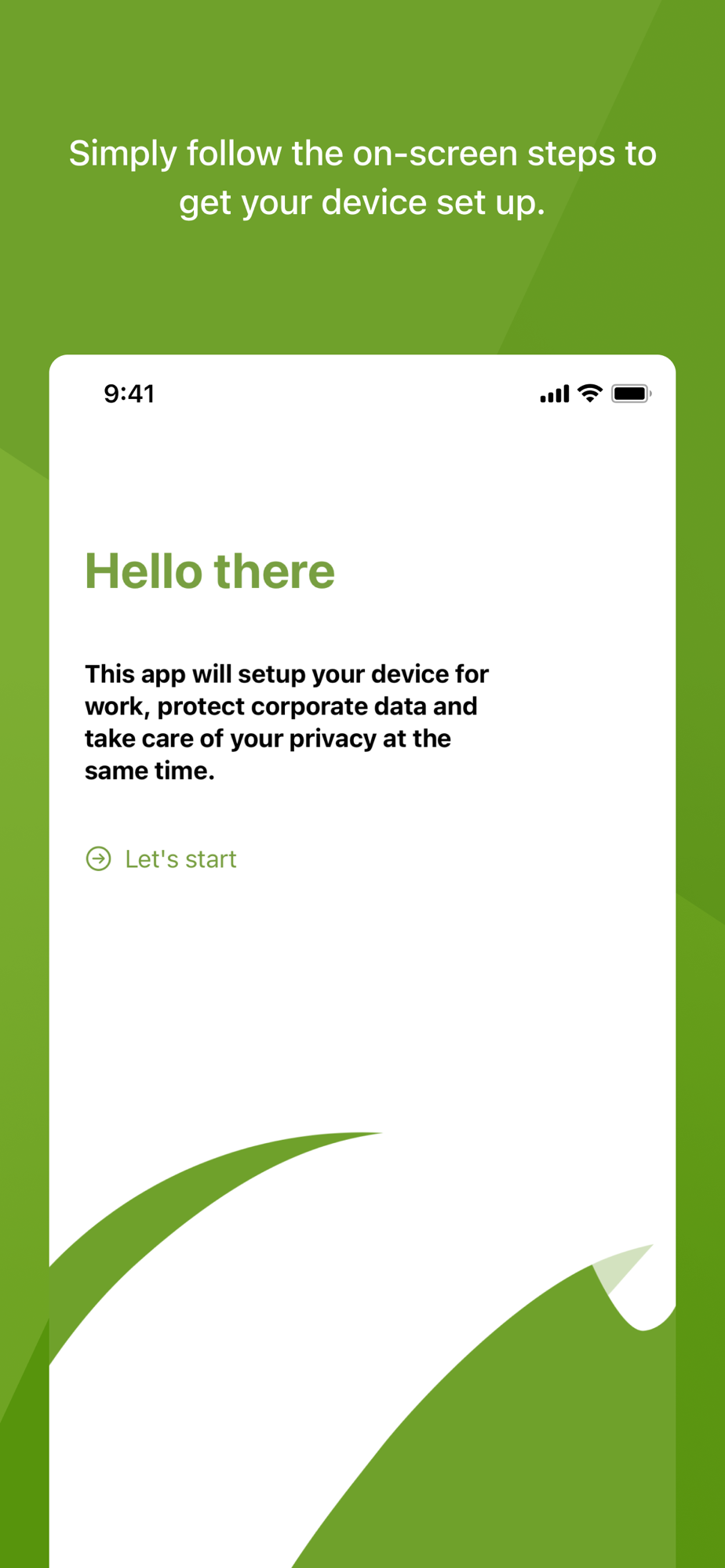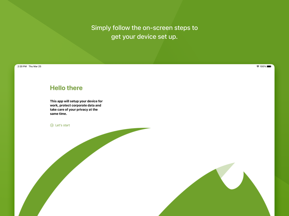 Email, Wi-Fi, VPN, and other corporate resources are automatically set up after installing the app and registering with your company's MDM account and are ready to use right away, whether your iPhone or iPad is provided by your company or if your private device is used.
