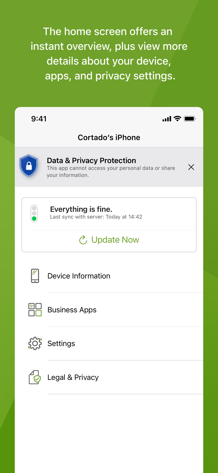 Once connected to Cortado's MDM system, an authorized administrator from your company can remotely manage and control business apps, data, security policies, and other relevant device and security settings on your iPhone or iPad.