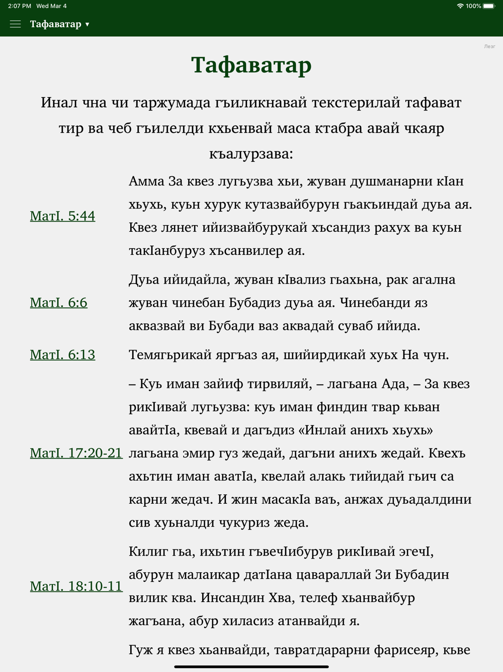 The Lezgi app (Bible, Scriptures, New Testament, Gospel) is aimed at native speakers of the Lezgi language and those who are interested in it. The translation was carried out by a group of specialists from the Institute for Bible Translation in the field of biblical studies and linguistics.