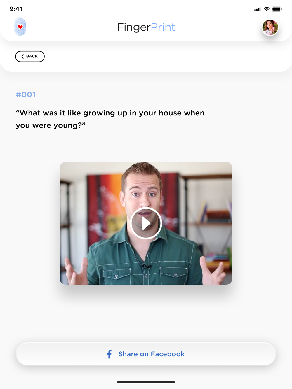 Then you will see a question prompt from the app (i.e. what's your favorite childhood memory? who was your first love? what's your favorite comfort food?), daily, weekly, or monthly...and when the question comes up on your screen you can tap record and it pulls up your phone camera so that you can create a video response to the question.