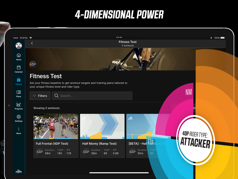 Other training apps set power targets based on a simple percentage of your sustained power (FTP). SYSTM uses a comprehensive 4DP® fitness test to calculate your Rider Type, identify your strengths and weaknesses, and measure what you’re capable of across 4 critical performance metrics: Neuromuscular Power (sprint power), Anaerobic Capacity (1-minute power), Maximal Aerobic Power (5-minute power), and FTP (20-minute power). Using 4DP®, SYSTM then tailors the power targets in your workouts so you get the most out of the time you have to train. You’ll work at the exact intensity necessary to get stronger and faster, without wasting a single pedal stroke.
