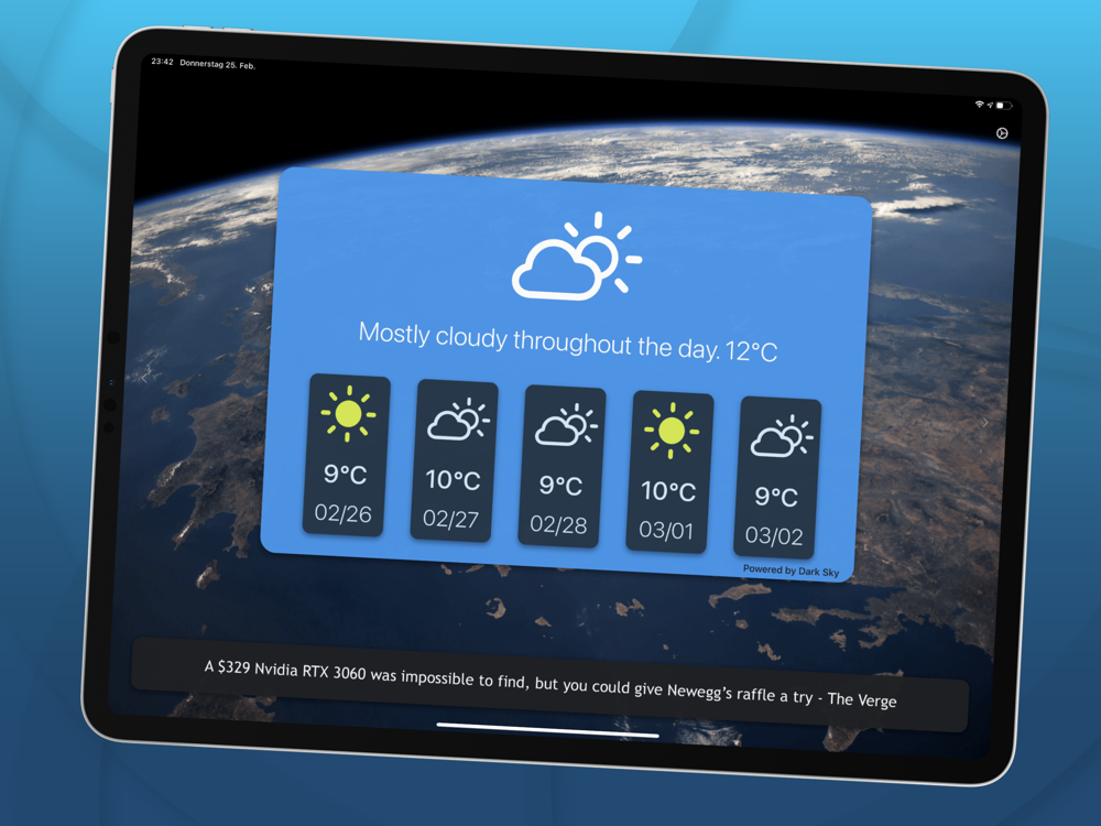Often tablets are only used on the sofa in the evening and they lie around for the rest of the day. SmartDisplay changes this and shows a lot of useful information and also looks good. SmartDisplay offers many different views, such as clock, weather forecast, news, calendar, notes, music player & more. A NewsTicker runs below each view, so you are always up to date with the latest developments in the world.