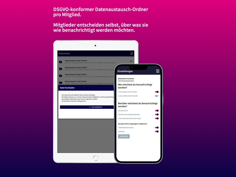 - Upload von Dokumenten: Fotografiere wichtige Dokumente, wie z.B. Ermäßigungsbescheide oder Bescheinigungen und sende diese einfach und datenschutzkonform über die App an Deine Mitgliederverwaltung.