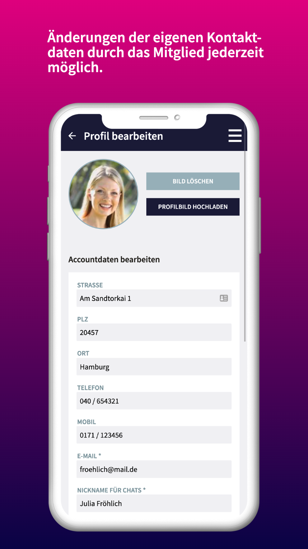 - Selbstverwaltung von Stammdaten: Ändere Deine eigenen Kontaktdaten oder die von Deinen Kindern jederzeit selbst oder lade ein eigenes Profilfoto hoch.