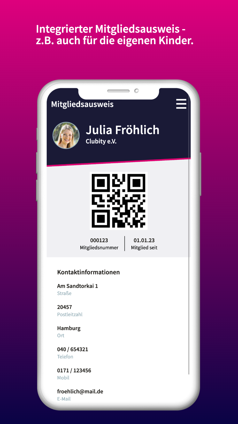 Mit der neusten Version der CLUBITY Mitglieder-App hast Du an einem Ort stets alle relevanten Vereinsinformationen- und Kontakte zur Hand. Ändere Deine Kontaktdaten mit nur wenigen Klicks, verwalte auf Wunsch auch die Daten Deiner Kinder oder nutze den integrierten Mitgliedsausweis zum komfortablen Check-In in den Sportstätten Deines Vereins.