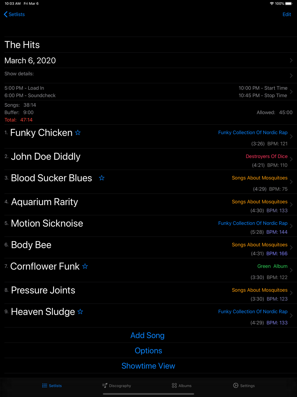 Setlist Supervisor is the premier setlist generator for musicians who want to craft the perfect setlist for their band while staying within of the time constraints of the gig. Add custom details about each song you can play like time (duration) , bpm (speed), fan favorites, album, and arrange and order your setlists with simple drag and drop tools. Determine how long your band’s set will actually be, even factoring in time between songs to let your fan’s thunderous applause fade! Use the BPM alert to warn you if the speed of your setlist slows down incrementally. Choose album colors to easily see if you are playing songs off of a variety of albums, or just one. Print or email pdfs of your setlist to your band members. Use Showtime View when it’s the day of the show to always show your set list to the band, and alert you when it’s time to get on and off the stage, or practice how long it really takes you to run through your set at band practice. Setlist Supervisor is everything bands need in a setlist generation tool, and is written entirely in Apple’s new declarative SwiftUI syntax for a responsive design across all platforms. Also looks great in Dark Mode!