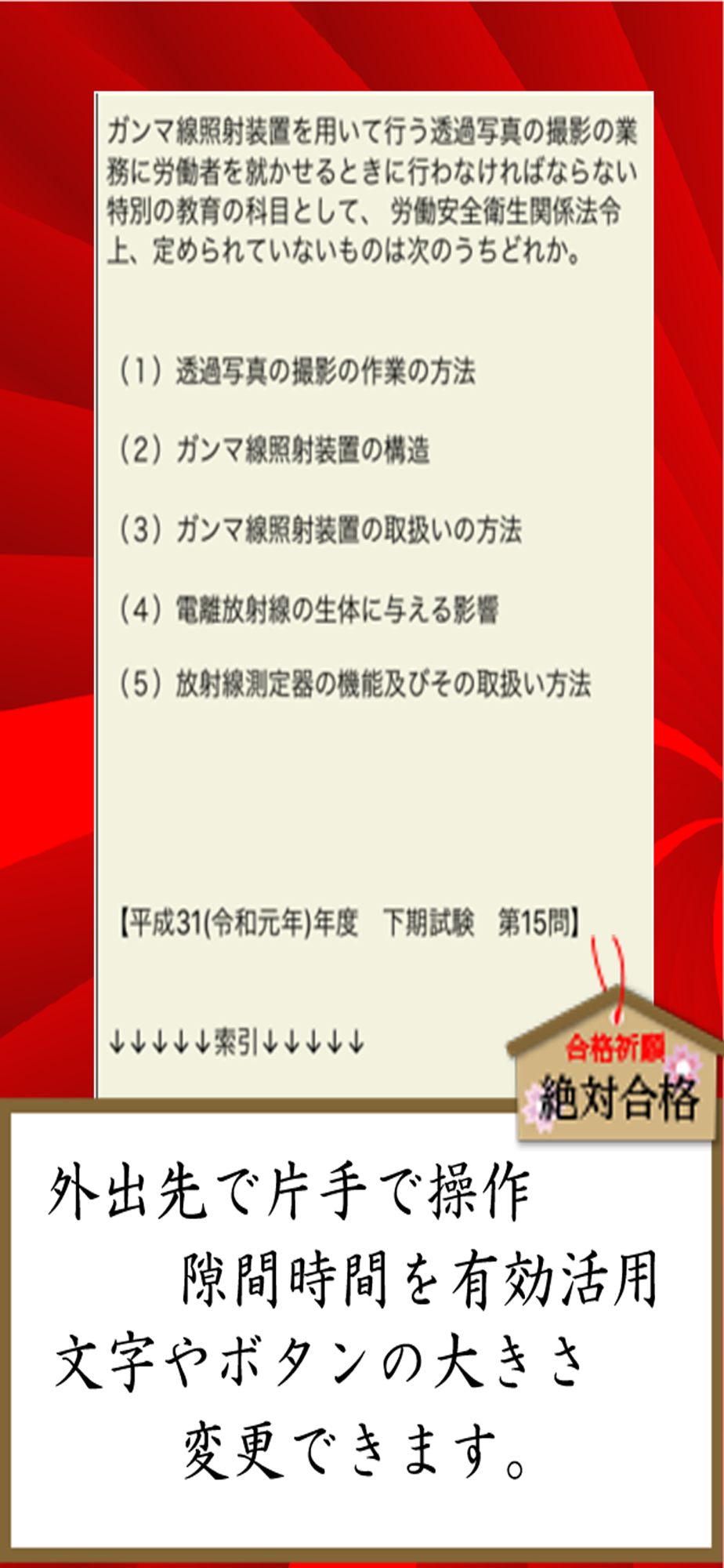 「ガンマ線透過写真撮影作業主任者」「潜水士」「高圧室内作業主任者」の過去問を収録したアプリです。