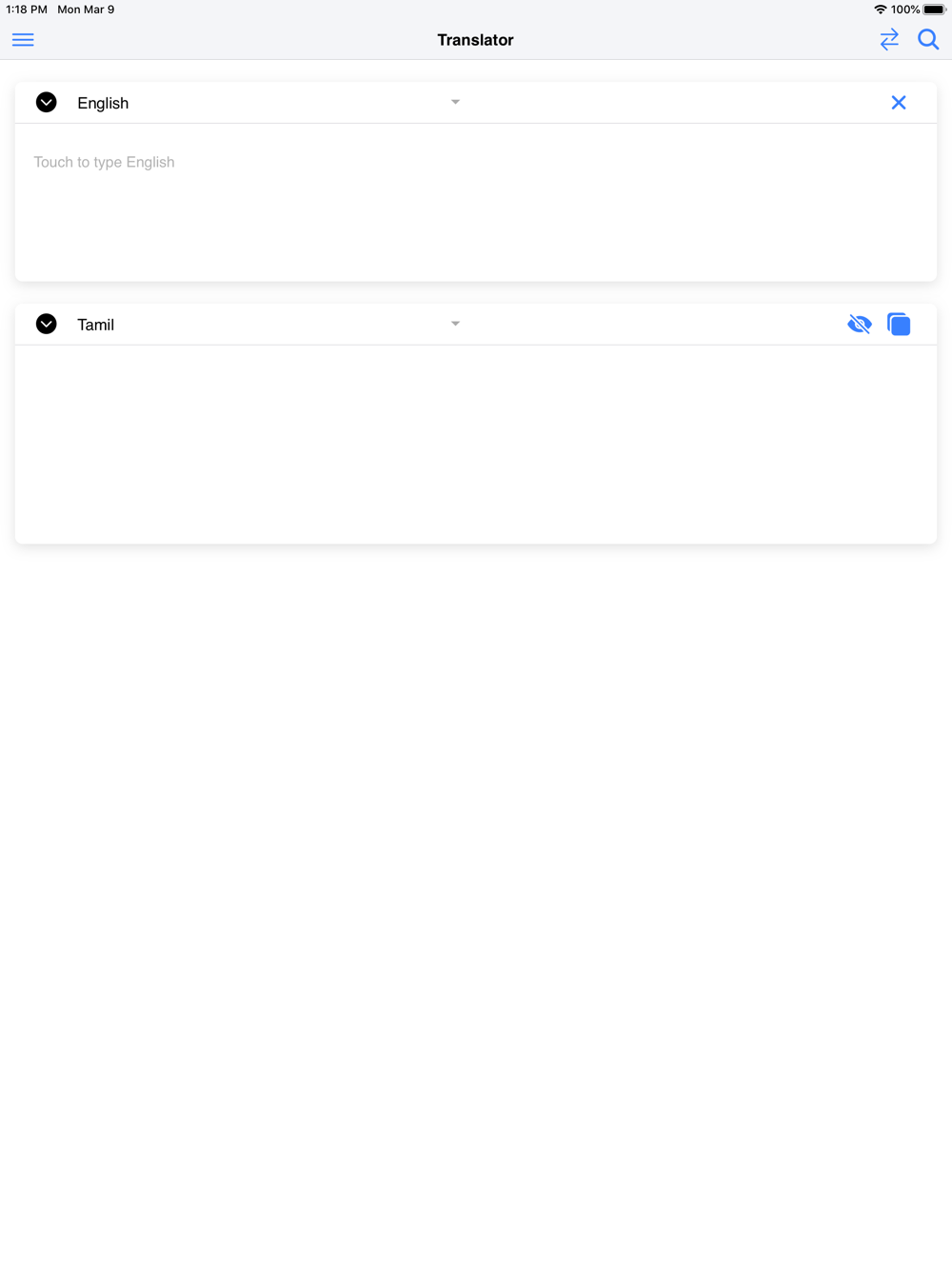Tamil Dictionary Offline is a FREE must-have app for English to Tamil / Tamil to English translation purposes, with a database of more than 400,000 words for iOS 11 and above.