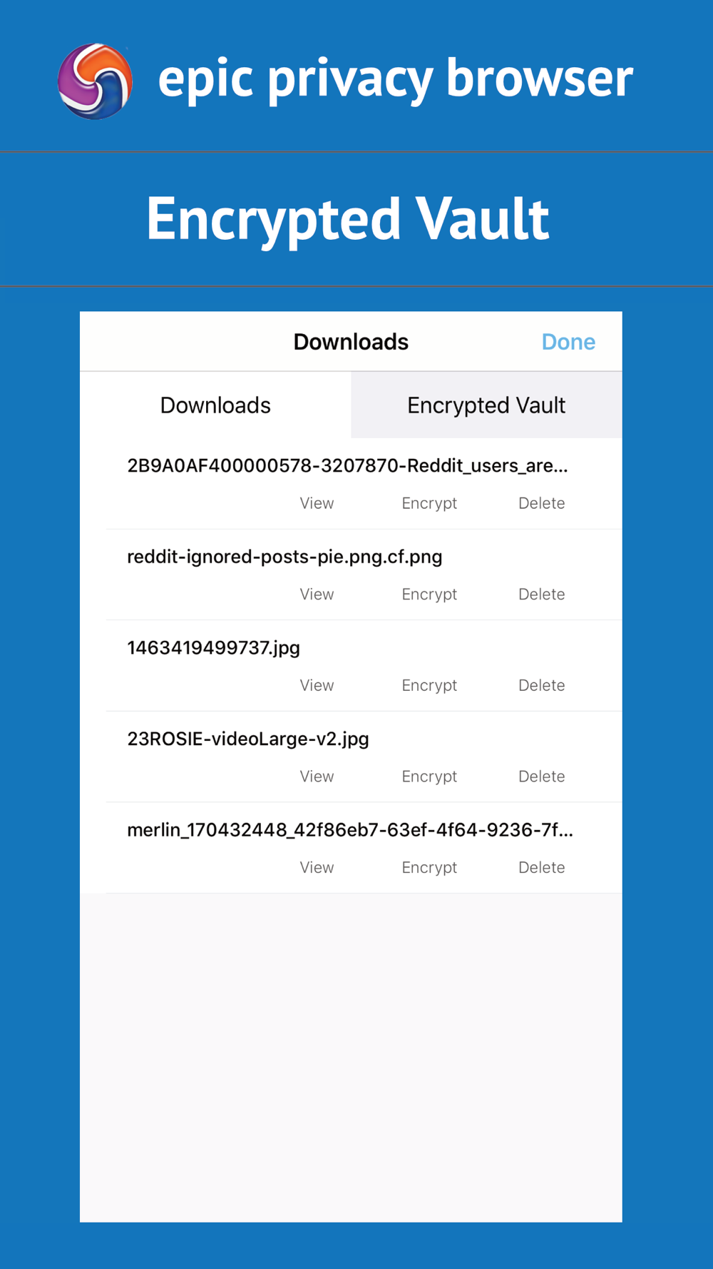 • Encrypted / Hidden Vault. Hide any files you download or store to protect your privacy.