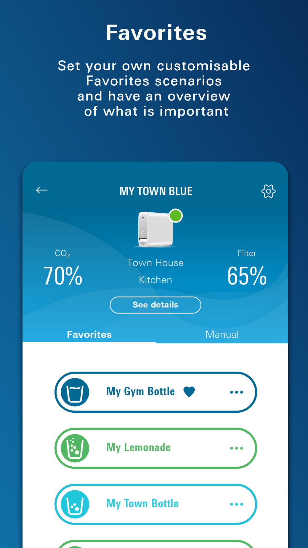 Within this app, you can also set up favourites for pouring water in a predefined amount and sparkling grade, and you can monitor your water consumption.
